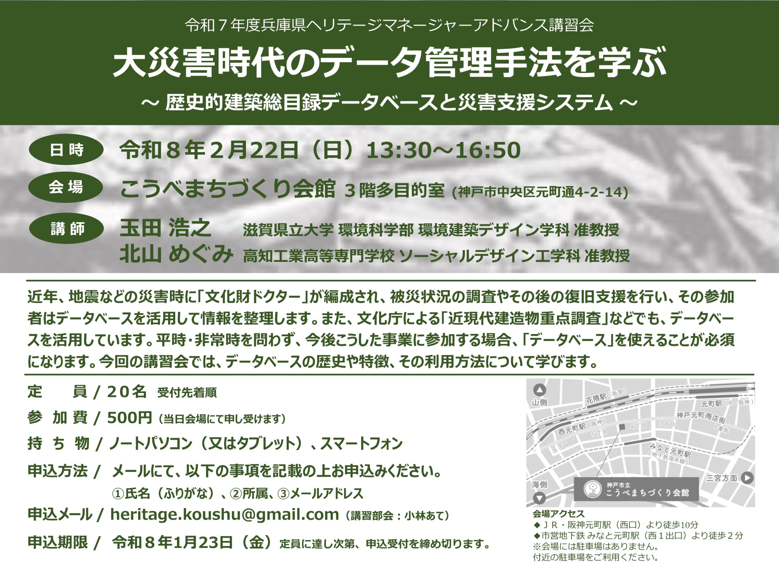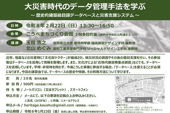 阪神淡路大震災から30年の企画の第三弾になりますが、今回は、災害時に、被災状況の調査やその後の復旧支援に活用されている、日本建築学会の「データベース」について学びます。文化庁などが編成し派遣する「文化財ドクター」では、このオンライン上のデータベースの使用が必須となっており、これが使えなければ参加することができません。